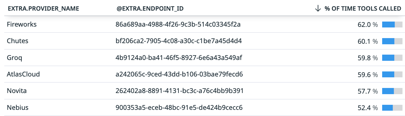 In aggregate, we have thousands of provider preferences for each model, that we can further restrict to LLM generations that provided tools. This is a powerful indicator of which providers are and aren’t performing well.