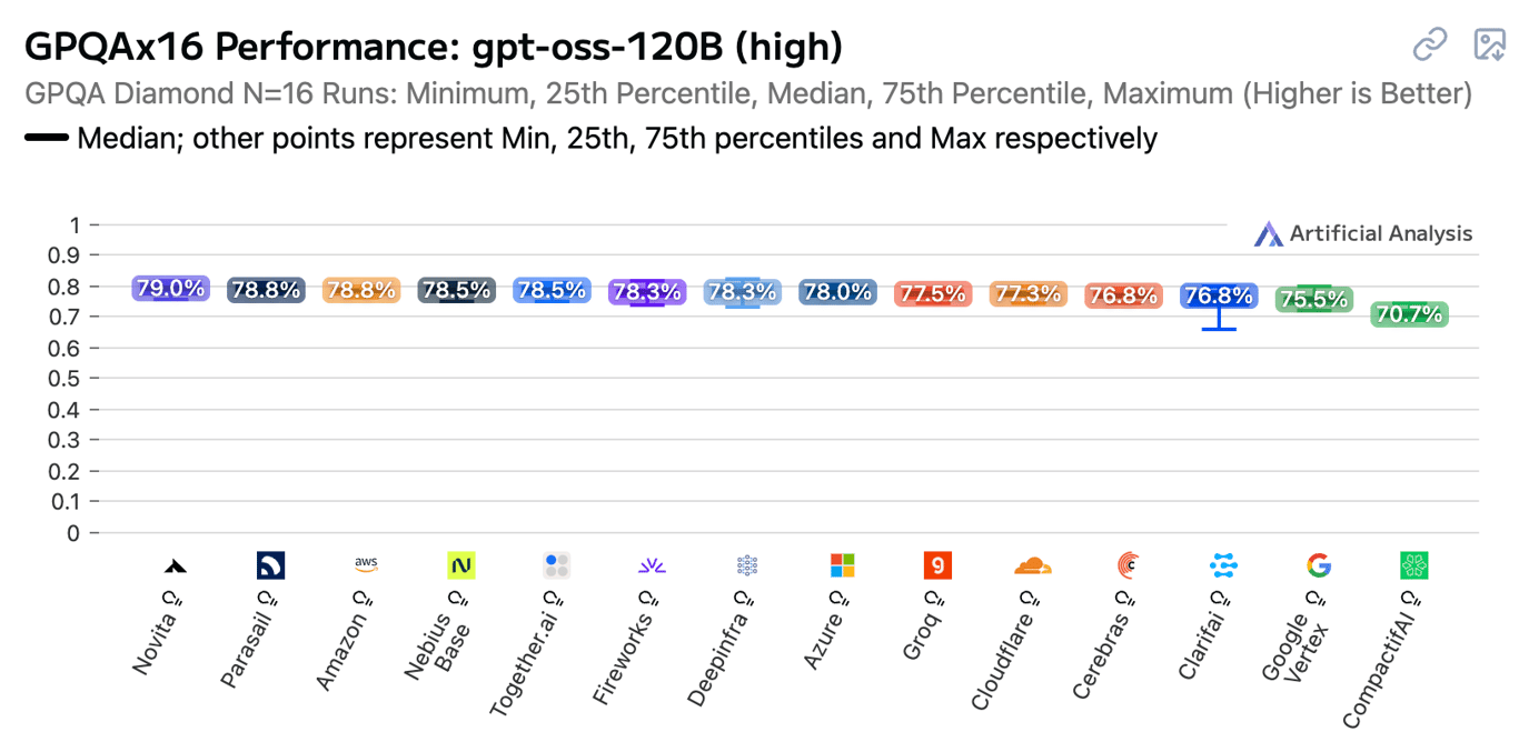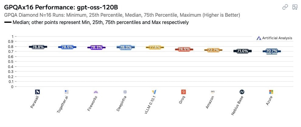 Artificial Analysis published a terrific set of benchmarks against gpt-oss-120b shortly after it came out, which showed significant differences between providers on a particular benchmark: