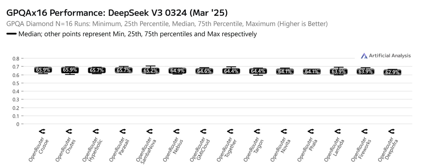 We worked with Artificial Analysis to run benchmarks on Deepseek 3.1 – a model that has been out for many months. Again we see a tight band of performance:
